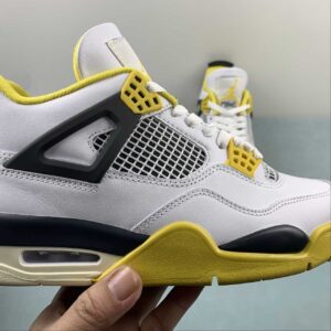 The Nike Air Jordan 4 Retro “Vivid Sulfur” is a women’s exclusive iteration of the classic AJ4 silhouette, blending heritage basketball styling with modern color flair. Featuring a crisp white leather upper with subtle Coconut Milk accents, this sneaker incorporates bold Vivid Sulfur yellow highlights on the Jumpman branding, lace eyelets, and outsole. Anthracite detailing adds contrast and depth, while signature AJ4 elements — such as mesh quarter panels, supportive “Wings,” and a visible Air-Sole unit — offer comfort, performance heritage, and street-ready style. :contentReference[oaicite:1]{index=1}
